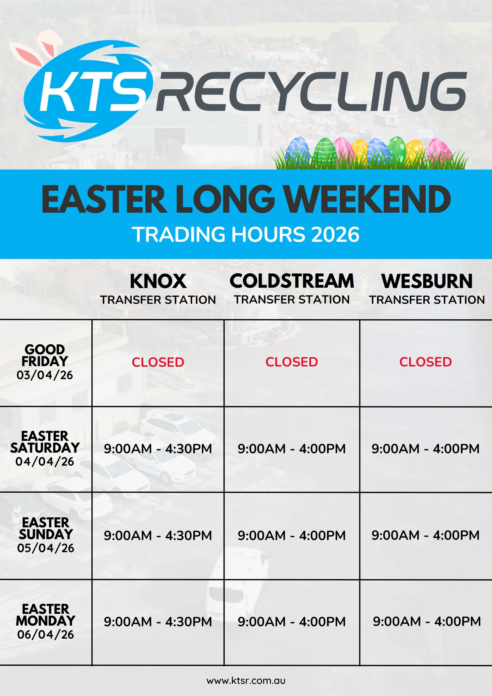 Below are the trading days and hours for all KTS Recycling sites:
